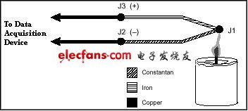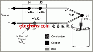圖3中,J2和J4接點(diǎn)屬于同一類型(銅鎳合金);因?yàn)閮烧咛幱诘葴丨h(huán)境,J2和J4也是同樣的溫度。因?yàn)殡娐分须娏鞣较蚓壒?,J4端產(chǎn)生一個(gè)Seebeck正電壓,J2端產(chǎn)生一個(gè)Seebeck負(fù)電壓。因此,接點(diǎn)抵消了相互之間的影響,測量電壓的總量就為零。J1和J3接點(diǎn)都是鐵—銅鎳合金接點(diǎn)。但是他們的溫度可能不同,因?yàn)樗麄兛赡懿皇窃诘葴丨h(huán)境中。因?yàn)樗麄兲幱诓煌瑴囟拳h(huán)境下,J1和J3接點(diǎn)都可以產(chǎn)生Seebeck電壓,但是大小不同。為了補(bǔ)償冷端J3,測量其溫度并將其作用電壓從熱電偶測量中減去。