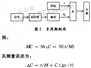 觸發(fā)誤差的抑制傳感器輸出的信號(hào)為矩形波信號(hào)由原始振蕩信號(hào)經(jīng)整形得到,信號(hào)中疊加的噪聲在整形時(shí)會(huì)使矩形波信號(hào)的觸發(fā)沿提前或滯后。多周期測(cè)周時(shí)使相鄰周期的觸發(fā)誤差相互抵消。M個(gè)周期的累計(jì)觸發(fā)誤差只相當(dāng)于單個(gè)周期的觸發(fā)誤差。