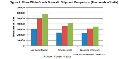 中國(guó)政府2010年旨在刺激本地消費(fèi)的補(bǔ)貼計(jì)劃,非常成功地刺激了中國(guó)白色家電市場(chǎng)。據(jù)IHS iSuppli公司的研究,2011年繼續(xù)實(shí)施補(bǔ)貼計(jì)劃將推動(dòng)白色家電市場(chǎng)進(jìn)一步增長(zhǎng)。