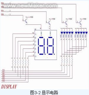 顯示電路由共陽極數(shù)碼管和10個(gè)LED組成,通過單片機(jī)位選和所送的數(shù)據(jù)來點(diǎn)亮相應(yīng)的LED和數(shù)碼管的顯示狀態(tài)。其電路原理圖如圖3-2所示: