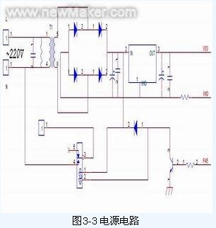 電源部分為單片機(jī)提供+5V的直流穩(wěn)壓源,并且通過降壓、整流、濾波之后的+14V電壓對(duì)繼電器進(jìn)行供電,通過控制三極管射極的導(dǎo)通與否來控制繼電器的工作狀態(tài)。電源電路原理圖如圖3-3所示: