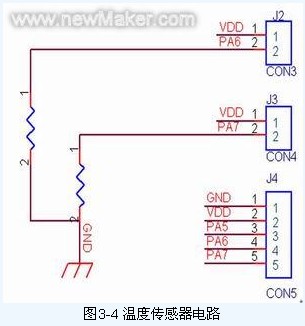 J2和J3是溫度傳感器的兩個(gè)接口,其中J2和J3分別是頂蓋和底盤溫度傳感器的接口,單片機(jī)檢測的信號(hào)實(shí)際上是與溫度傳感器分壓的電阻的電壓值,由于溫度傳感器的電阻值會(huì)隨溫度的上升而減小,所以分壓電阻的電壓值間接反映了某一時(shí)刻的溫度,電路原理圖如圖3-4所示: