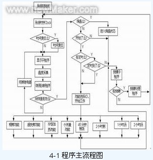 從樣機(jī)分析中大致設(shè)計(jì)整個(gè)系統(tǒng),整個(gè)系統(tǒng)輸進(jìn)包括2個(gè)溫度傳感器,5個(gè)按鍵;輸出包括2位七段數(shù)碼管、10個(gè)發(fā)光二極管、繼電器控制信號(hào)等。根據(jù)控制功能,將程序設(shè)計(jì)為幾個(gè)主要的模塊,程序主流程見圖4-1所示: