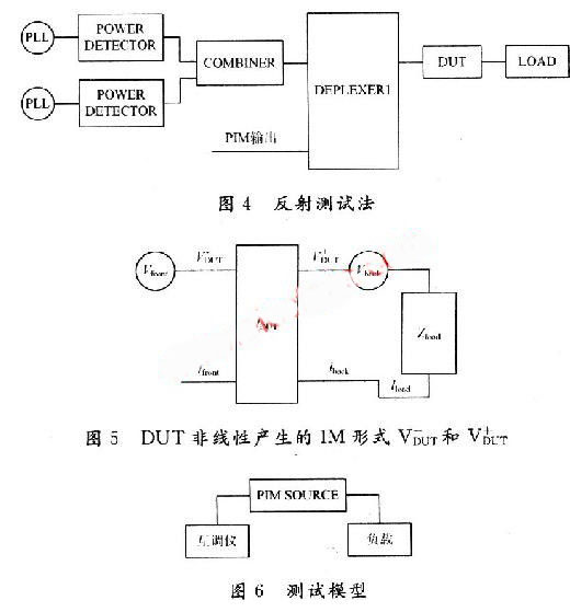 該系統(tǒng)中兩個大功率載頻f1和f2通過雙工濾波器發(fā)射到DUT,終端接50 Ω負載。PIM產生的雜散信號在DUT中產生,并在兩個方向傳播——“前向”到匹配負載,“反向”到雙工濾波器。發(fā)射激勵信號的頻率和被測的IM產物的頻 率由雙工濾波器的TX和RX通道決定。接收機測量反向傳播的IM波功率。
