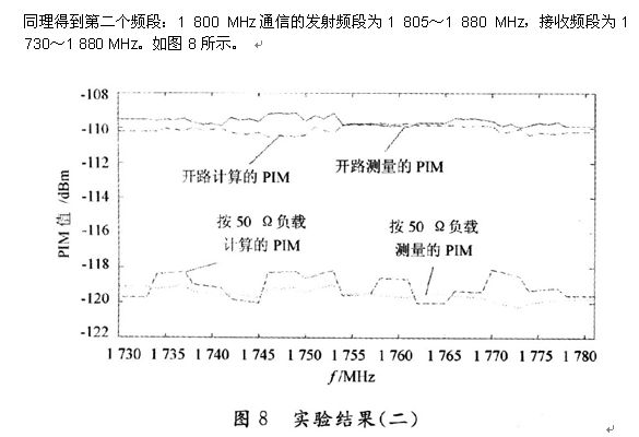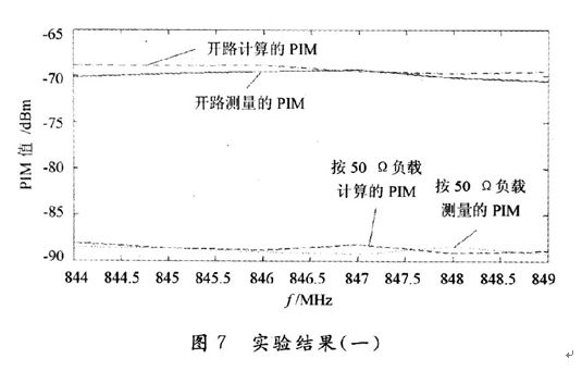為了驗證該方法的有效性,本文給出了兩個頻段的PIM值的計算與測量結果對比。頻段l:800 MHz的通信系統(tǒng)的發(fā)射頻段為869~894 MHz,接收頻段為824~849 MHz。如圖7所示。
