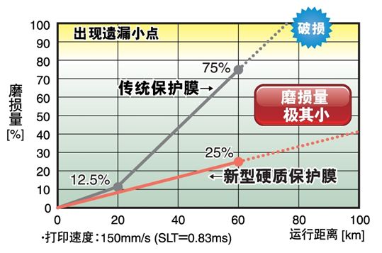 為了應(yīng)對這種情況,采取了將打印頭的保護(hù)膜材料變更為硬質(zhì)材料等對策,但提高保護(hù)膜的強(qiáng)度的課題是保護(hù)膜的組成和發(fā)熱部分的形狀設(shè)計(jì)。在以往的產(chǎn)品中,使用某些劣質(zhì)熱敏紙時(shí),使用壽命僅10km左右,這當(dāng)然與打印機(jī)的使用頻率也有關(guān)系,但發(fā)生過幾個(gè)月左右就無法使用的案例。羅姆面對這種情況,一直致力于改善保護(hù)膜材料中的硬質(zhì)材料的結(jié)構(gòu)和打印頭結(jié)構(gòu)。這次開發(fā)的熱敏打印頭通過優(yōu)化保護(hù)膜材料的構(gòu)成物質(zhì)及其組成,大幅提高了耐磨性,實(shí)現(xiàn)了比以往產(chǎn)品高約3倍的耐久性(保證150km(以往產(chǎn)品是50km))。另外,通過提高保護(hù)膜的熱導(dǎo)率,打印效率也比以往改善了15%,同時(shí)還提高了打印質(zhì)量。而且,這種打印頭的形狀保持與以往產(chǎn)品完全相同,因此無需進(jìn)行打印機(jī)的設(shè)計(jì)變更,另外,這種規(guī)格還可以用于修補(bǔ)替換。