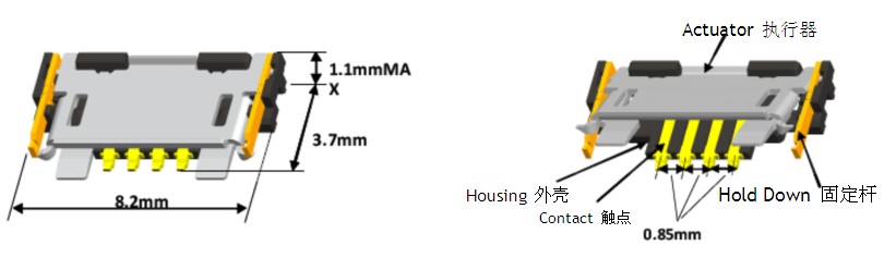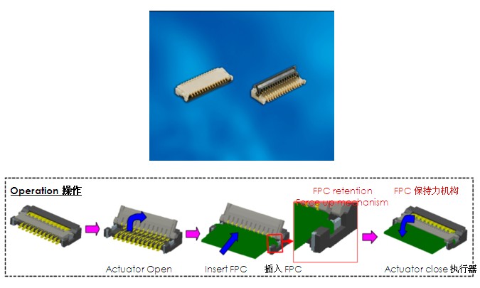 該連接器為0.2毫米(錯位排列)連接間距,帶有0.4毫米導向位。目前可提供11針和29針,計劃最多達81針。連接器高度為0.9+/-毫米。其外殼材料為熱塑塑料(UL 94V-0), 固定調(diào)整片和連接器的銅合金無鹵素。作為底部接觸型產(chǎn)品,因此可最為廣泛地適用于掀蓋式執(zhí)行器,很方便進行關門操作。就連接器規(guī)格而言,連接器可通過帶有外殼開槽結(jié)構(gòu)的耳式電纜分割結(jié)構(gòu)提供電纜預持功能。要求的電纜厚度是:0.2毫米+/-0.03