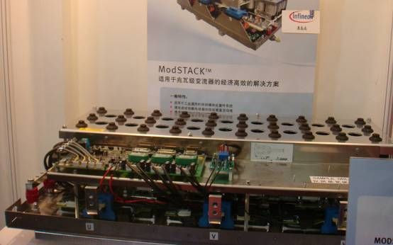 由于在大功率IGBT上有很大的優(yōu)勢,英飛凌這次幾乎將一個風(fēng)電站搬到了會場,現(xiàn)場展示了其最新ModSTACK平臺,據(jù)介紹,這個平臺采用水冷方式,效率更高,可以用于大型風(fēng)電站,輸出功率達(dá)到2兆瓦!