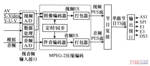 MPEG-2壓縮編碼器是將模擬電視視音頻信號進行MPEG-2壓縮編碼輸出實時TS流的前端設備,適用于數(shù)字電視的傳輸或前端信源編碼以及會議電視、遠程教育等各種應用,一臺高級的編碼器不僅具有DVB接口,還應當設有電信接口,以使該設備能方便地在HFC網(wǎng)絡、微波MMDS或8GHZ系統(tǒng)、SDH或PDH等網(wǎng)絡中應用,如圖1所示。