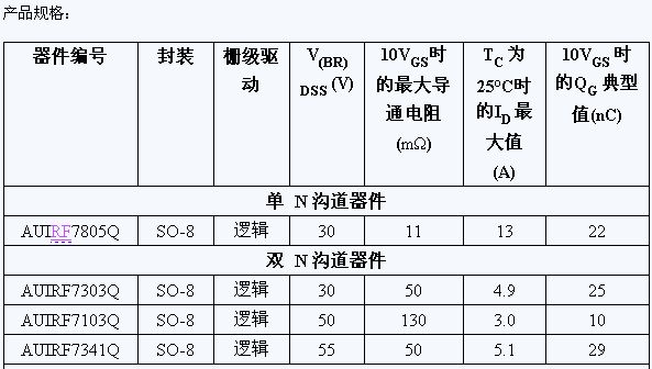 IR 的車用 MOSFET 都遵循 IR 要求零缺陷的汽車質(zhì)量理念,并經(jīng)過了動(dòng)態(tài)和靜態(tài)器件平均測(cè)試及 100% 自動(dòng)晶圓級(jí)目視檢查。