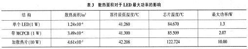 表3為3種不同散熱方式對(duì)LED的溫度分布、最大功率的影響??梢钥闯?,增加散熱面積是很好的散熱方式,可以輕易地提高LED器件散熱能力,這是目前LED產(chǎn)品所普遍使用的散熱方式之一。然而缺點(diǎn)也很明顯:影響成本、增加產(chǎn)品重量、影響封裝密度。無限度地提高LED散熱片面積顯然不現(xiàn)實(shí),因此一般使用1.5inch2散熱片提升LED產(chǎn)品最大功率至10W左右,出于成本等因素就不能繼續(xù)提高。