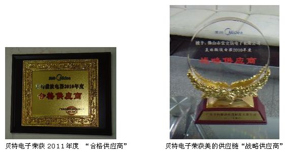 與美的合作近8年來,貝特電子有限公司憑借過硬的產(chǎn)品質(zhì)量,極強(qiáng)的研發(fā)能力,優(yōu)質(zhì)的售前售后服務(wù),成功獲得“合格供應(yīng)商”及“戰(zhàn)略供應(yīng)商”兩項大獎,并得到獎金3萬元。