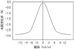AMR單體是用鎳和鐵等制成的強(qiáng)磁性金屬合金。一般采用硅(Si)制成,當(dāng)遇到施加的電流方向垂直的磁場(chǎng)時(shí),阻抗值發(fā)生變化。這個(gè)現(xiàn)象就稱為磁阻效應(yīng),特性如圖1所示。它以0(零)H為軸,正負(fù)兩側(cè)對(duì)稱的特性,因此是不區(qū)別磁鐵的N極和S極的兩極檢測(cè)。