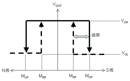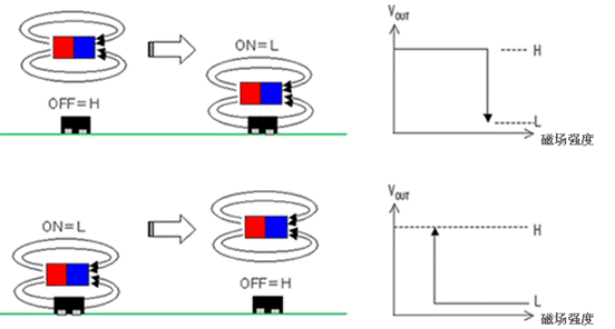 AS系列能夠通過(guò)磁鐵和傳感器之間的距離改變來(lái)檢測(cè)出磁通密度的變化,控制傳感器輸出信號(hào)的開關(guān)(高(H)<=>低(L)),如圖5所示。當(dāng)磁鐵接近傳感器,使磁場(chǎng)的強(qiáng)度變大,則傳感器的輸出就會(huì)由“高”變“低”,反之則由“低”變“高”。