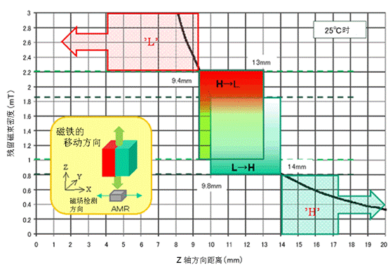 在電氣設(shè)計(jì)上,需要考慮傳感器的特性,使用的磁鐵特性,以及和傳感器的位置關(guān)系。圖7是模擬將鐵氧體磁鐵(5×4×6mm)沿Z軸(遠(yuǎn)離傳感器)方向移動(dòng)時(shí)的情況。從傳感器的磁滯開始,9.4mm以下輸出信號(hào)一定是“低”(靠近磁鐵,蓋閉合);14mm以上輸出信號(hào)一定為“高”(遠(yuǎn)離磁鐵,蓋打開)。實(shí)際設(shè)計(jì)的時(shí)候,還需要考慮到傳感器特性的偏差、溫度特性,磁鐵的溫度特性,生產(chǎn)時(shí)以及時(shí)間長(zhǎng)了之后傳感器的位置偏移。