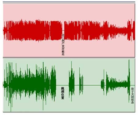 在同步過程中,S在170m左右時,在無屏蔽隔阻的情況下出現(xiàn)跑頻現(xiàn)象,再前進約5m就完全沒有信號,參見圖2(下):L有212m左右時進入北門洞,由于屏蔽很嚴重而出現(xiàn)跑頻現(xiàn)象,參見圖2(上)。圖2的時間座標相同,波形中中斷部分為因跑頻而贊成的無接收信號,可以看出。L的接收情況遠好于S。