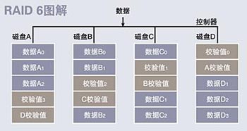 RAID-6的全稱是“IndependentDatadiskswithtwoindependentdistributedparityschemes(帶有兩個(gè)獨(dú)立分布式校驗(yàn)方案的獨(dú)立數(shù)據(jù)磁盤)”。RAID6與RAID5的不同之處于除了每個(gè)磁盤上都有同級數(shù)據(jù)校驗(yàn)區(qū)外,還有一個(gè)針對每個(gè)數(shù)據(jù)塊的校驗(yàn)區(qū)。當(dāng)然,當(dāng)前盤數(shù)據(jù)塊的校驗(yàn)數(shù)據(jù)不可能存在當(dāng)前盤而是交錯(cuò)存儲的,具體形式見圖。