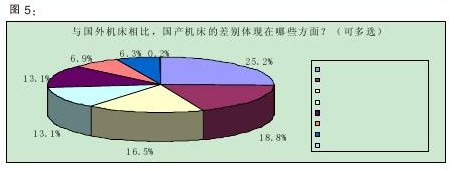 據(jù)中國機(jī)床工具工業(yè)協(xié)會(huì)統(tǒng)計(jì),2010年我國機(jī)床工具產(chǎn)品進(jìn)口總額為157.2億美元,同比增長62.0%,國內(nèi)機(jī)床進(jìn)口額與歷史最高的2008年同期相比還增長了27.8%,創(chuàng)歷史新高。進(jìn)口的增長迅猛表明國內(nèi)機(jī)床與國外機(jī)床的差距依然很大。本次調(diào)查報(bào)告顯示,中外機(jī)床的差距主要體現(xiàn)在三個(gè)方面:加工精度(25.2%)、可靠性(18.8%)、機(jī)床內(nèi)部電、氣、控等配置(16.5%)。緊跟其后的是加工速度和外形方面的色彩、精美程度等,均占13.1%(詳見圖5)。由此可見,技術(shù)尤其是對(duì)精準(zhǔn)度和可靠度是國外機(jī)床領(lǐng)先國內(nèi)機(jī)床的優(yōu)勢來源。另外,對(duì)外形的關(guān)注也是近年來客戶在使用方面出現(xiàn)的一種新口味。