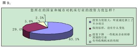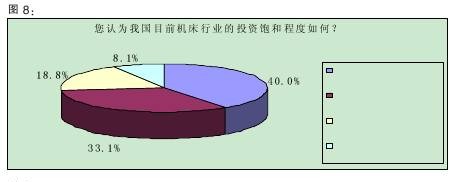 調(diào)查數(shù)據(jù)顯示,40.0%的受訪者認(rèn)為我國目前機(jī)床行業(yè)的投資“大體上飽和,但還有投資空間”,33.1%認(rèn)為“不飽和,還需要加大投資力度”。(詳見圖8)該結(jié)果表明,三分之一的被訪者認(rèn)為機(jī)床行業(yè)還有投資的空間,加上那些認(rèn)為投資空間很大的比例,有超過一半的人認(rèn)為機(jī)床行業(yè)還應(yīng)該增加投資,業(yè)界對(duì)機(jī)床行業(yè)的預(yù)期由此可見一斑。