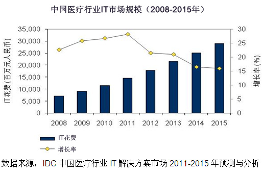 區(qū)域醫(yī)療信息平臺建設(shè)已逐步成為醫(yī)療信息化發(fā)展的引擎,醫(yī)療信息化市場繼續(xù)高速增長。根據(jù)IDC最近發(fā)布的報(bào)告《中國醫(yī)療行業(yè)IT解決方案市場2011-2015年預(yù)測與分析》,2010年醫(yī)療行業(yè)IT花費(fèi)是114.1億元人民幣,較2009增長26.7%;預(yù)測到2015年IT花費(fèi)市場規(guī)模達(dá)到290.2億元,2010至2015年的年復(fù)合增長率為20.5%。在各類醫(yī)療解決方案中,區(qū)域醫(yī)療信息平臺的增長最快,2010-2015年復(fù)合增長率達(dá)24.7%。
