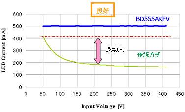 為了防止出現(xiàn)這種閃爍現(xiàn)象,需要有能夠確保保持電流恒定的泄放電路,各制造廠商采用各種各樣的方式構(gòu)成泄放電路。BD555AKFV內(nèi)置有羅姆獨創(chuàng)的泄放電路,采取了避免無謂損失的措施。