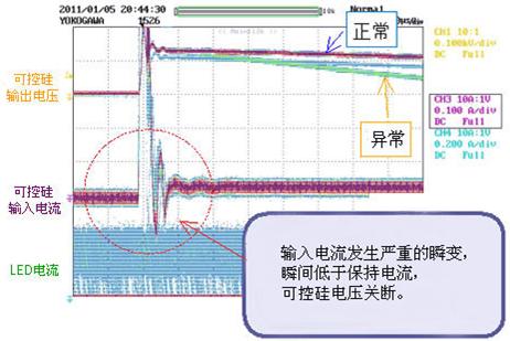 可控硅調(diào)光器在可控硅處于導(dǎo)通狀態(tài)時必須使保持電流持續(xù)流通;一旦保持電流下降,可控硅便關(guān)斷了。由于LED照明燈與原有照明燈相比,功耗極低,所以使可控硅的保持電流下降,調(diào)光器就往往會因此而不定期關(guān)斷從而發(fā)生閃變(閃爍)現(xiàn)象。(圖5)