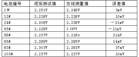 根據(jù)規(guī)程的要求,日常測量蓄電池端電壓采用是高精度4位半的數(shù)字萬用表,一般高精度萬用表蓄電池直流電壓檔測量精度為0.7%以上,絕大多數(shù)蓄電池在線裝置產(chǎn)品說明書上提到的測量精度達(dá)到了0.5%以上;顯示測量數(shù)值有些蓄電池在線裝置的測量端電壓數(shù)值為小數(shù)點后2位,與規(guī)程要求有較大誤差;有些裝置測量值雖可以到小數(shù)點后3位,但與實際用表測量數(shù)值相差較大。從運行情況看,端電壓在線監(jiān)測的誤差是隨機,每個數(shù)值偏差都不一致,而且偏差值隨著環(huán)境溫度、浮充電壓變化等而變化。表1為現(xiàn)場任意抽查幾個蓄電池浮充電壓,現(xiàn)場測試值與在線測量值的誤差情況,現(xiàn)場測試采用FLUK111數(shù)值萬用表直流檔測量精度0.7%,在線測量為許繼電源公司的WXJ-16型巡檢儀,測試環(huán)境溫度25℃。