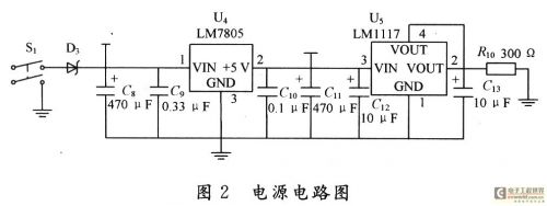 不同芯片對供電電壓的要求也不同,本測試系統(tǒng)中,單片機P89LPC938所需的電壓為3.3 V,而電平轉(zhuǎn)換芯片MAX232所需要的電壓為5 V,因此,電源模塊的設(shè)計要滿足需求,設(shè)計時就需要兼顧兩者,外部只需提供12 V電壓即可。圖2給出電源電路的電路圖,本系統(tǒng)選用LM7805和LM1117兩個穩(wěn)壓器。