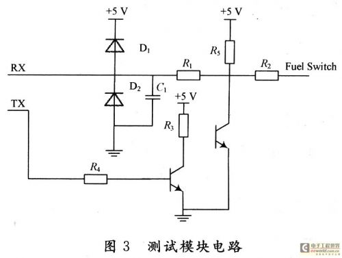 當(dāng)測試系統(tǒng)的TX端發(fā)送高電平時,A點為高電平,燃料開關(guān)Fuel Switch信號線也將接收到高電平,同時,測試系統(tǒng)的RX端也會接收到高電平。同理,當(dāng)測試系統(tǒng)的TX端發(fā)送低電平時,燃料開關(guān)FuelSwitch信號線也將接收到低電平,同時,測試系統(tǒng)的RX端也會接收到低電平。