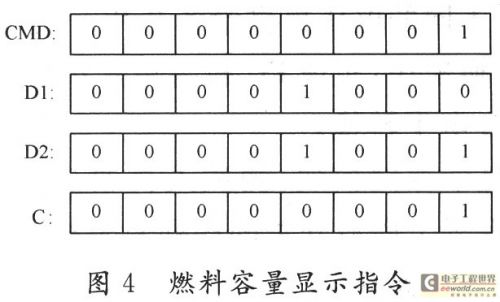(2)單片機P89LPC938通過串口接收到“volume”命令,從指令集中提取相應(yīng)的指令信號。圖4給出單片機向燃料開關(guān)發(fā)出的一條燃料容量顯示指令。