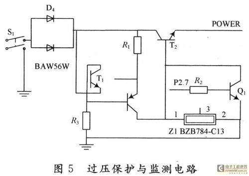 燃料開關(guān)外部需+12 V電壓供電,經(jīng)產(chǎn)品內(nèi)部電源電路轉(zhuǎn)化為+5 V電壓給單片機提供電壓,因此如果其電源電路出現(xiàn)故障,或受到汽車內(nèi)其他電器設(shè)備的電壓干擾使提供給單片機的電壓過高,或由于其他形式的制造缺陷,都有可能使被測開關(guān)的電源異常,這會損壞燃料開關(guān),進而損壞與相連接的測試系統(tǒng)。因此,需要設(shè)計一個過壓保護與檢測電路,檢測燃料開關(guān)內(nèi)的單片機的電源電壓,當(dāng)此電壓正常時(+5 V±2%),測試系統(tǒng)可以繼續(xù)對其檢測,但當(dāng)此電壓過高,則自動切斷燃料開關(guān)的外部電源,達到保護燃料開關(guān)的目的。圖5即為該保護電路。