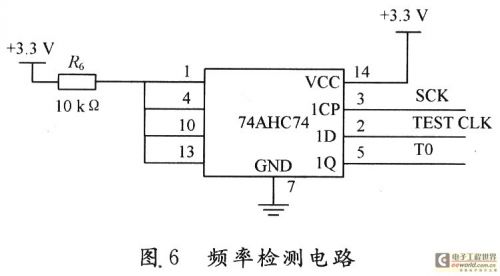 燃料開關(guān)是以數(shù)字通信方式與其他組件進行協(xié)同工作的,異步通信的工作頻率則取自其中單片機的內(nèi)部時鐘,由于制造離散度及環(huán)境溫度等的影響,實際的工作頻率會發(fā)生漂移。為確保通信的可靠性,需要確認燃料開關(guān)工作在適當(dāng)?shù)念l率范圍內(nèi),故需要對其實際的通信頻率檢測與確認。要測試時鐘信號的頻率,可以通過測試一定區(qū)間內(nèi)脈沖的個數(shù)來實現(xiàn),測試時間越長,精度越高。本測試系統(tǒng)用D觸發(fā)器和單片機的計數(shù)、定時功能來完成此檢測。圖6即為此頻率檢測電路。