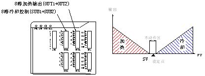 DTE10T在擴展輸出模塊后,SUB1輸出口可定義為冷卻輸出控制。利用雙PID計算,在溫度沒有沖過設(shè)定值時,溫控器就可提前啟動冷卻風(fēng)機,避免了溫度從高不下的情,并能保持溫度穩(wěn)定性。個人認(rèn)為報警驅(qū)動的冷卻模式總將由于控溫不穩(wěn)定等原因被淘汰。雙PID控制方式必定是追求更高控溫精度的首選。如圖5所示。