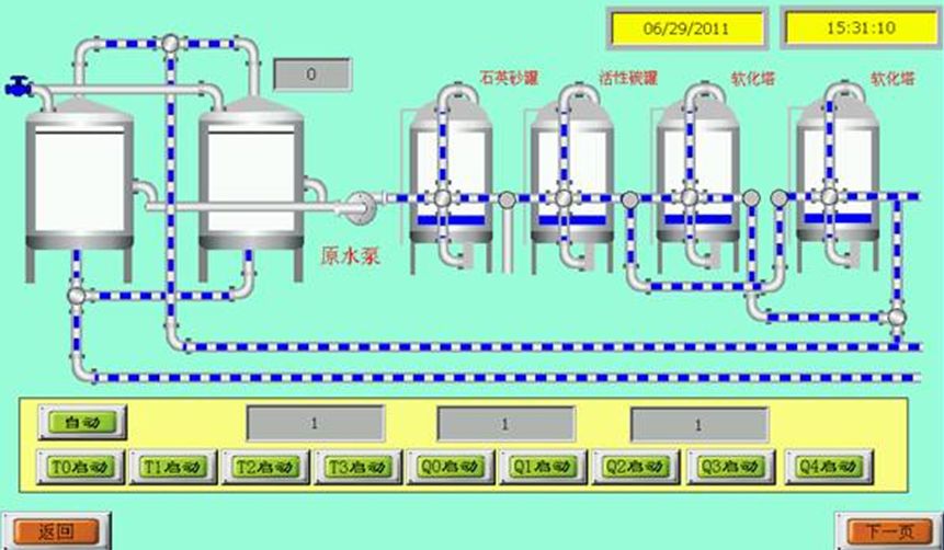 制藥用水是不含任何添加物的工藝用水。制藥用水的系統(tǒng)控制要控制這些雜質(zhì)的含量,同時還要有效處理和控制微生物及細(xì)菌內(nèi)毒素的污染。通常會采用離子樹脂交換、蒸餾冷凝、電滲析、反滲透等工藝方式。其制備流程大致分為五部分:預(yù)處理、初級除鹽裝置、深度除鹽裝置、后處理裝置、純水輸送分配系統(tǒng)。純化水設(shè)備包含機(jī)械部分和電氣部分:機(jī)械部分主要由水泵、壓力罐、水箱、電磁閥、過濾器和管路組成;電氣部分主要由可編程控制器(PLC)、觸摸屏、變頻器、壓力表、繼電器等組成。圖1為制備純化水的一個現(xiàn)場展示案例。