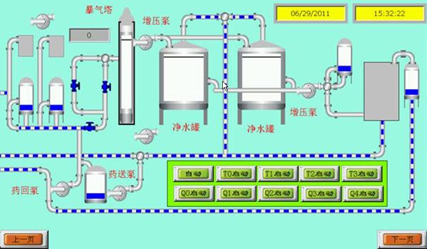 觸摸屏主要功能是顯示和控制制水過程中的數(shù)據(jù)以及水泵電磁閥的的運(yùn)行狀態(tài)。PLC輸入量有各個閥門的開閉情況和各罐體的液位情況和壓力情況,其中輸入量中的液位是模擬量輸入;輸出量有水泵的啟動停止,電磁閥的開閉,報警等等。圖3為部分觸摸屏的控制界面(初期設(shè)計)。