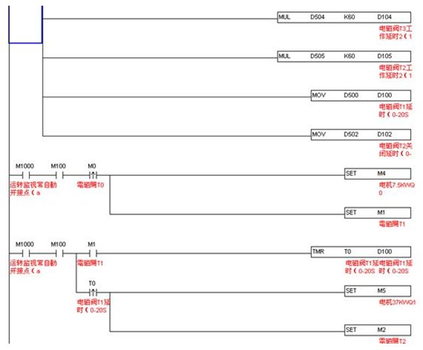 PLC程序主要分為以下基本:初始化部分、模擬量采集部分、數(shù)據(jù)處理部分、邏輯控制部分(手動和自動)、報警部分等組成。圖4為部分PLC程序設(shè)計。