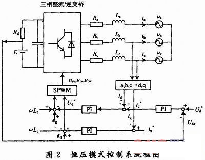 在對(duì)機(jī)車(chē)蓄電池充電時(shí),為了快速充電同時(shí)延長(zhǎng)電池的使用壽命,將充電與放電過(guò)程分成不同的階段,可以視具體情況分階段選擇恒流或者恒壓模式充放電。恒壓充放電模式采用電壓定向控制模式,控制框圖如圖2所示??刂撇呗圆捎秒p閉環(huán)結(jié)構(gòu),外環(huán)控制直流電壓,內(nèi)環(huán)控制電流。電流內(nèi)環(huán)作用是提高系統(tǒng)的動(dòng)態(tài)性能和實(shí)現(xiàn)限流保護(hù),電壓外環(huán)的作用是保證直流側(cè)電壓的穩(wěn)定性。直流輸出電壓給定信號(hào)和實(shí)際直流電壓Vdc比較后的誤差信號(hào)送入P1調(diào)節(jié)器,PI調(diào)節(jié)器的輸出即為主電路交流輸入?yún)⒖茧娏鞯姆?,比較得到電流誤差后,對(duì)電流誤差進(jìn)行PI調(diào)節(jié),用以減緩電流在動(dòng)態(tài)過(guò)程中的突變。然后再與輸入電壓的空間矢量進(jìn)行比較控制,最后通過(guò)SPWM調(diào)制算法即可生成相應(yīng)6路驅(qū)動(dòng)脈沖控制三相整流橋IGBT的通斷,間接地控制網(wǎng)側(cè)電流,實(shí)現(xiàn)網(wǎng)側(cè)功率因素的調(diào)節(jié)。