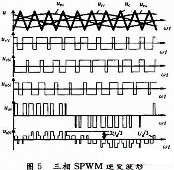 本文采用SPWM調(diào)制方式。圖2中,三相調(diào)制信號(hào)uru、urv和urw為相位依次相差120°的正弦波。a,b,c相自關(guān)斷開(kāi)關(guān)器件的控制方法相同,現(xiàn)以a相為例:在uru>uc的各區(qū)間,給上橋臂電力晶體管V1以導(dǎo)通驅(qū)動(dòng)信號(hào),而給下橋臂V4以關(guān)斷信號(hào)。在uru<uc的各區(qū)間,給V1以關(guān)斷信號(hào),V4以導(dǎo)通信號(hào)。圖5是三相橋式PWM逆變電路輸出三相對(duì)于負(fù)載中性點(diǎn)N的相電壓波形。