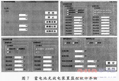 為了驗(yàn)證課題所設(shè)計(jì)的蓄電池充放電裝置的功能,設(shè)計(jì)了檢測(cè)與監(jiān)控系統(tǒng)。軟件的部分界面如圖7所示。