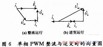 圖6是a相在整流運(yùn)行、逆變運(yùn)行時(shí)的相量圖。在SPWM調(diào)制方式下,電網(wǎng)電壓ua與ua產(chǎn)生的基波分量uao為正弦波,流過(guò)電感La的電流也為正弦波。圖6所示,從a相電路的相量圖可以很容易地看出,三相電壓源型PWM雙向變流器可以實(shí)現(xiàn)單位功率因數(shù)運(yùn)行。