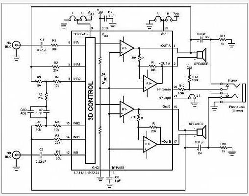觀察到的3D數(shù)量也取決于其它許多因素,如喇叭的放置及與收聽者的距離。因此,建議用戶嘗試R5(R3D)和 C7(C3D)的各種數(shù)值,以感覺3D效應如何在應用程序中工作。對于效果來說沒有什么對或錯,而只是使每位用戶達到最滿意的程度問題而已。請注意當啟動 3D模式時,(R3和R4),(R7和R6)的設置僅用于增益控制。當抑制3D模式時,增益由R2和R8設置。