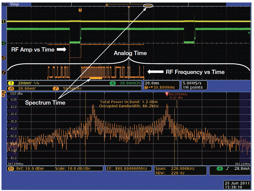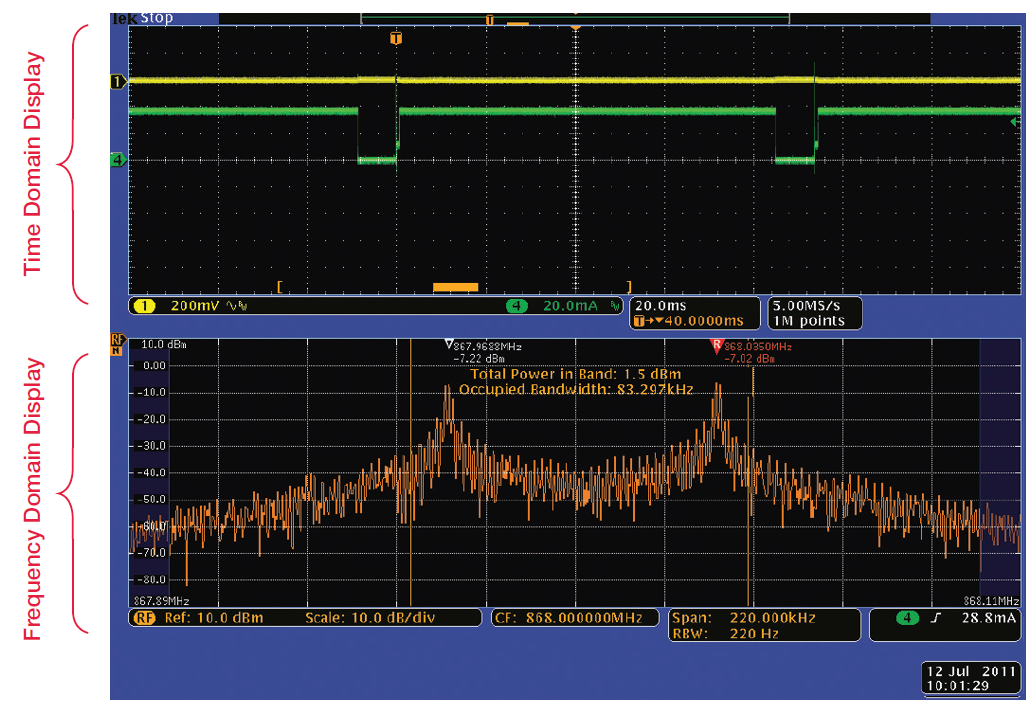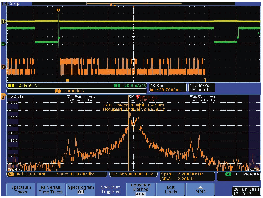 我們測量以868 MHz為中心的無線電頻譜,其擁有相當?shù)偷? kbps的FSK調制數(shù)據(jù)速率,以供參考。圖2顯示了參考頻譜。注意MDO同時顯示時域視圖和頻域視圖,所有信號都時間相關。[page]