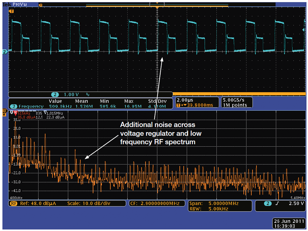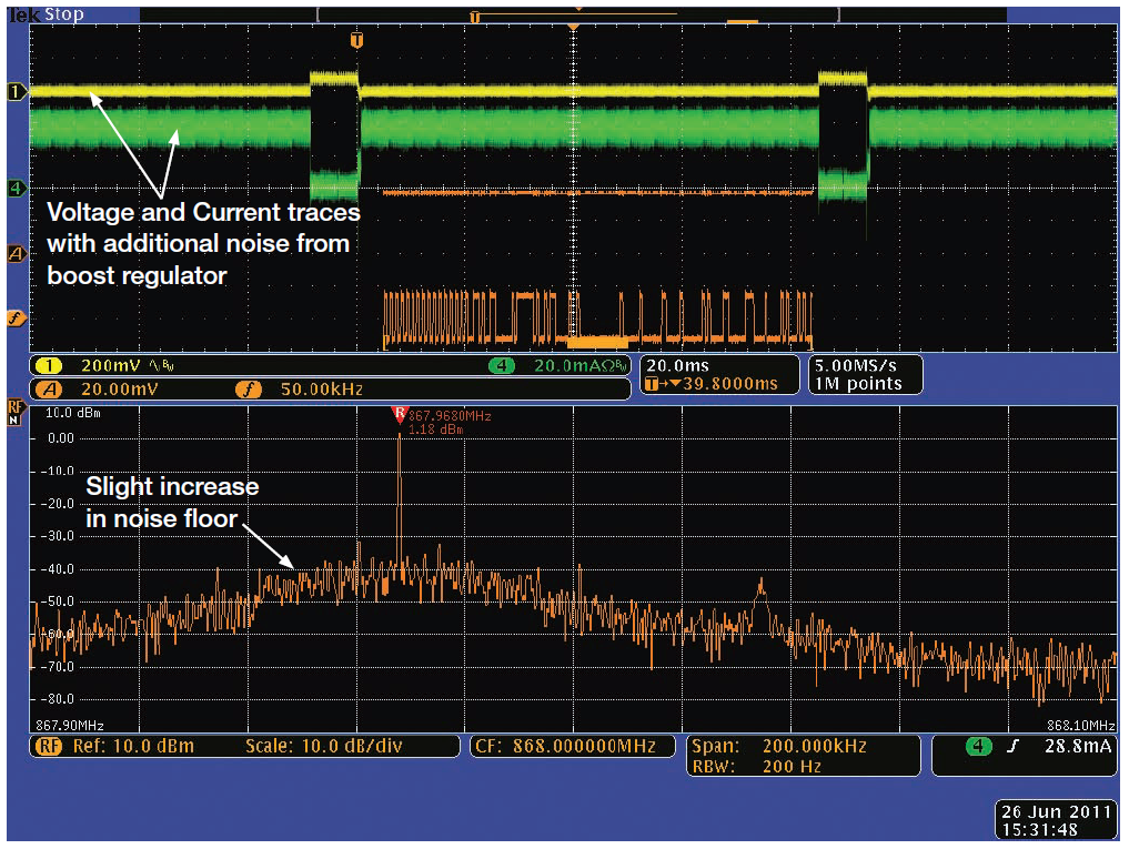 上圖是在使用干凈的實驗室電源供電的模塊中獲得的,這在實際環(huán)境中很難實現(xiàn),但可以作用實用參考。圖4顯示了相同的RF信號,但使用升壓型開關電源為無線電模塊供電。升壓穩(wěn)壓器因產(chǎn)生噪聲而臭名昭著,但它允許使用一個或兩個堿性或鎳鎘單元及相對較少的器件,降低了成本。注意被調制信號底部的噪聲提高。在發(fā)送的信號附近,噪聲至少要比干凈的電源高5 dB。噪聲已經(jīng)容易地顯現(xiàn)在電流波形和電壓波形中。額外的噪聲還會令從發(fā)射機收集這些數(shù)據(jù)所使用的接收機上的信號信噪比劣化,降低無線電系統(tǒng)的有效范圍。