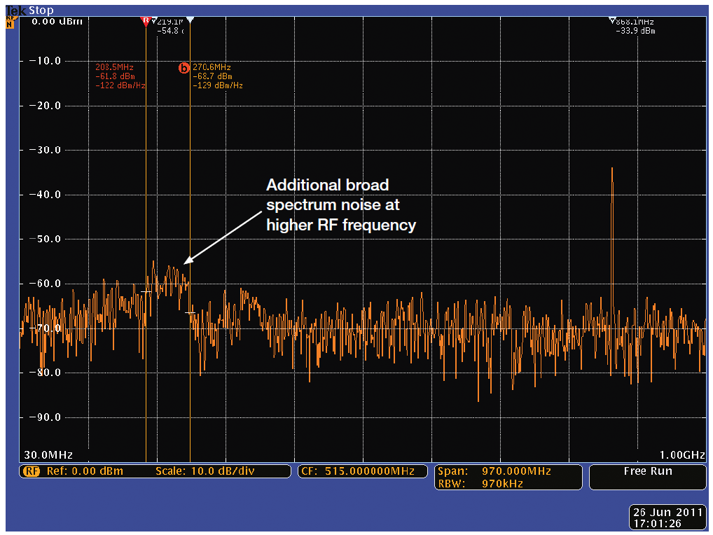 圖7. 在使用升壓轉換器時來自數(shù)字電路板的寬頻譜噪聲。