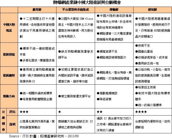感知層一直以來都是臺廠之強項,加上中國大陸目前技術(shù)較為薄弱,短期臺灣感測芯片廠具有較大之優(yōu)勢。應(yīng)用部分,智能電網(wǎng)與智能醫(yī)療在中國大陸將是最大的應(yīng)用領(lǐng)域與投資方向。但由于物聯(lián)網(wǎng)應(yīng)用范圍廣大,涉及各個層面,資源難以集中發(fā)展,臺廠可藉由差異化案例作為利基,將解決方案包裝后整案輸出。例如,臺灣目前推動的智能生活計畫,所積累的物聯(lián)網(wǎng)發(fā)展經(jīng)驗及成熟技術(shù),如智能農(nóng)業(yè)、智能醫(yī)療、智能電表等,都是臺廠可藉力使力、搶攻物聯(lián)網(wǎng)應(yīng)用市場的機會。