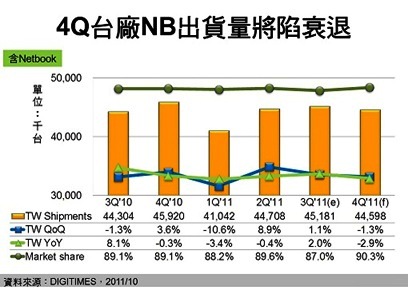 9月部分品牌NB出貨雖見(jiàn)回溫,但主因是庫(kù)存過(guò)低回補(bǔ),非因市場(chǎng)需求回升所致。簡(jiǎn)佩萍預(yù)估,第三季的低迷市況,將延續(xù)至第四季,年成長(zhǎng)率也將再度陷入衰退。而因惠普訂單從偉創(chuàng)力回流至臺(tái)廠,雖使得第四季臺(tái)廠占全球NB出貨量比重提升至90.3%,但2011年臺(tái)廠將僅有第三季的NB出貨量年成長(zhǎng)率為正。