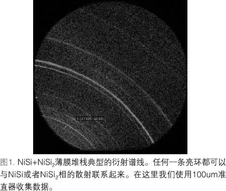 相分析要求事先了解感興趣的相。一種自動化的峰擬合算法用來獲得曲線中每一個峰的位置和強度值。將實驗峰值的位置與感興趣相的譜線作對比,來確定該相是否存在。另外,曲線中不能被匹配的峰意味著更多的相存在。例如在圖2中,如果取樣程式認為在測量的硅片上只存在鎳單硅化物,盡管事實上相的鑒定需要手工完成,但多余的峰(來自于NiSi2)仍然會被軟件標(biāo)記。為了測量不同相的比例,一種針對多相系統(tǒng)的應(yīng)用遵循了這樣的原理,即一個獨立相衍射峰的強度(一級近似)與薄膜中對應(yīng)相的數(shù)量成比例。