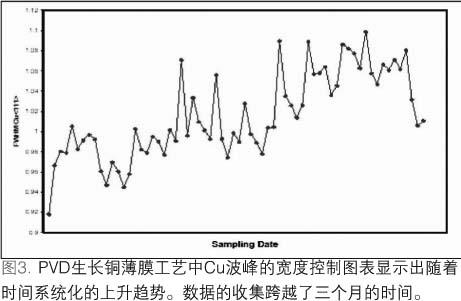 這種設(shè)備最初的一種應(yīng)用是監(jiān)測一系列物理氣相淀積(PVD)的反應(yīng)腔,這些反應(yīng)腔在銅互連金屬化制程中被用來淀積TaN/Ta/Cu襯墊層和籽晶層。這種監(jiān)測作為標(biāo)準(zhǔn)的平面電阻,膜厚量測的補充而存在。薄膜堆棧中Ta和Cu成分的織構(gòu)強度和譜線展寬數(shù)據(jù)都需要收集。TaN層具有無定形結(jié)構(gòu),因此無法監(jiān)測。圖3說明了一個從銅元素峰寬控制圖表中輸出的例子。數(shù)據(jù)的趨勢穩(wěn)步向上,表明PVD銅籽晶的平均晶粒大小隨著時間在減小。圖4說明了在相應(yīng)的Rs圖表中類似但并不十分顯著的增加。隨后的設(shè)備診斷發(fā)現(xiàn)受影響的反應(yīng)腔一個閥門有空氣泄漏的現(xiàn)象。泄漏影響到濺射工藝,進而影響銅籽晶層的淀積,這一過程極有可能是在淀積和淀積之后的自退火過程中,由于銅在Ta表面的遷移率下降造成。更換了閥門之后,Rs和銅元素峰寬的值都變小,我們從圖3和圖4控制圖表中的最后三個數(shù)據(jù)點可以看出。