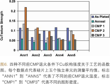 硅片在制程中的三個不同步驟進行測量:電鍍之后,前CMP退火之后,金屬化之后。圖6說明了在M1測得的銅織構(gòu)強度的結(jié)果。我們將最終結(jié)果作了平均,因為沒有觀察到銅微結(jié)構(gòu)在硅片中央和邊緣有任何不同。從數(shù)據(jù)中可以看出很多趨勢,但應(yīng)該強調(diào)的是,微結(jié)構(gòu)的數(shù)據(jù)可以與其他線上量測的結(jié)果直接聯(lián)系起來,特別是硅片的良率。所有的結(jié)果綜合起來,可以選擇出該技術(shù)節(jié)點比較優(yōu)化的前CMP退火條件。