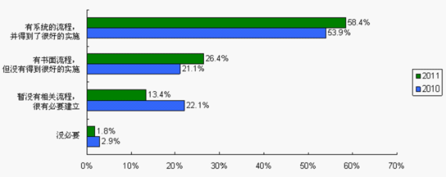 供求雙方把伙伴關(guān)系建立在專業(yè)評估的基礎(chǔ)上,通過系統(tǒng)流程可以有效減少供應(yīng)商認(rèn)證和引入過程中的不合理操作、暗箱操作、防范采購風(fēng)險(xiǎn)、提高采購效率。在供應(yīng)商認(rèn)證與引入過程中,沒有建立和認(rèn)為沒必要建立系統(tǒng)流程的受訪者比例由2010調(diào)查的25%(22.1%+2.9%)降至2011調(diào)查的15.2%(13.4%+1.8%),已經(jīng)建立流程并且得到很好實(shí)施的比例也由2010調(diào)查的53.9%上升至2011調(diào)查的58.4%。